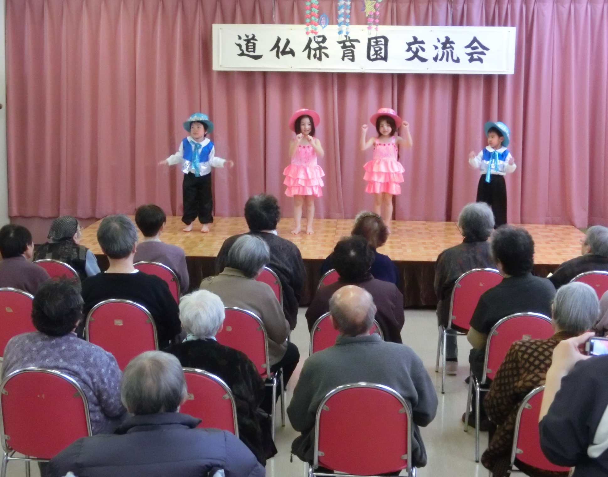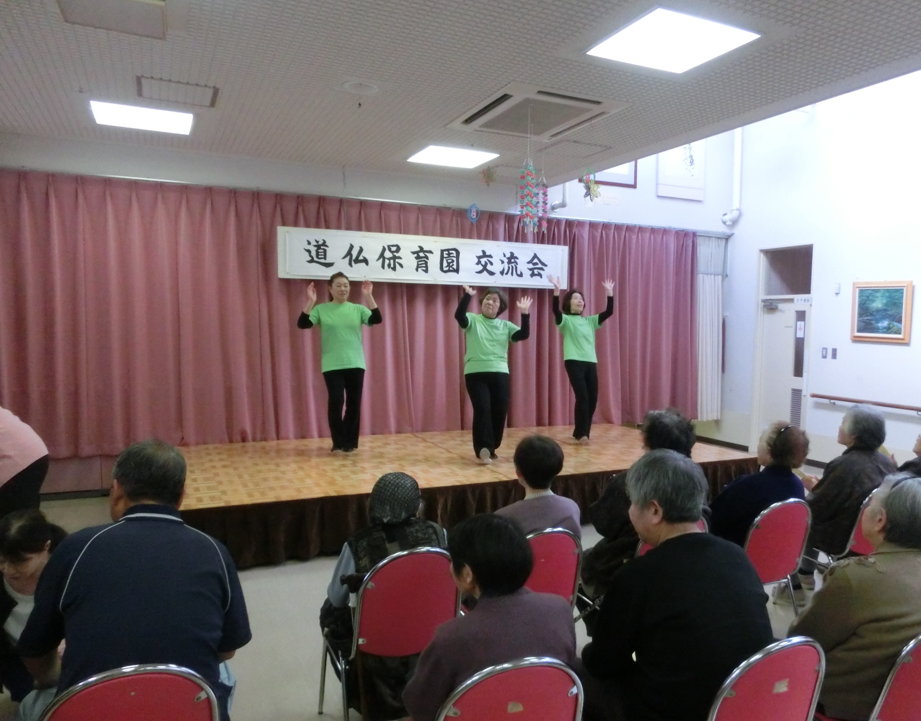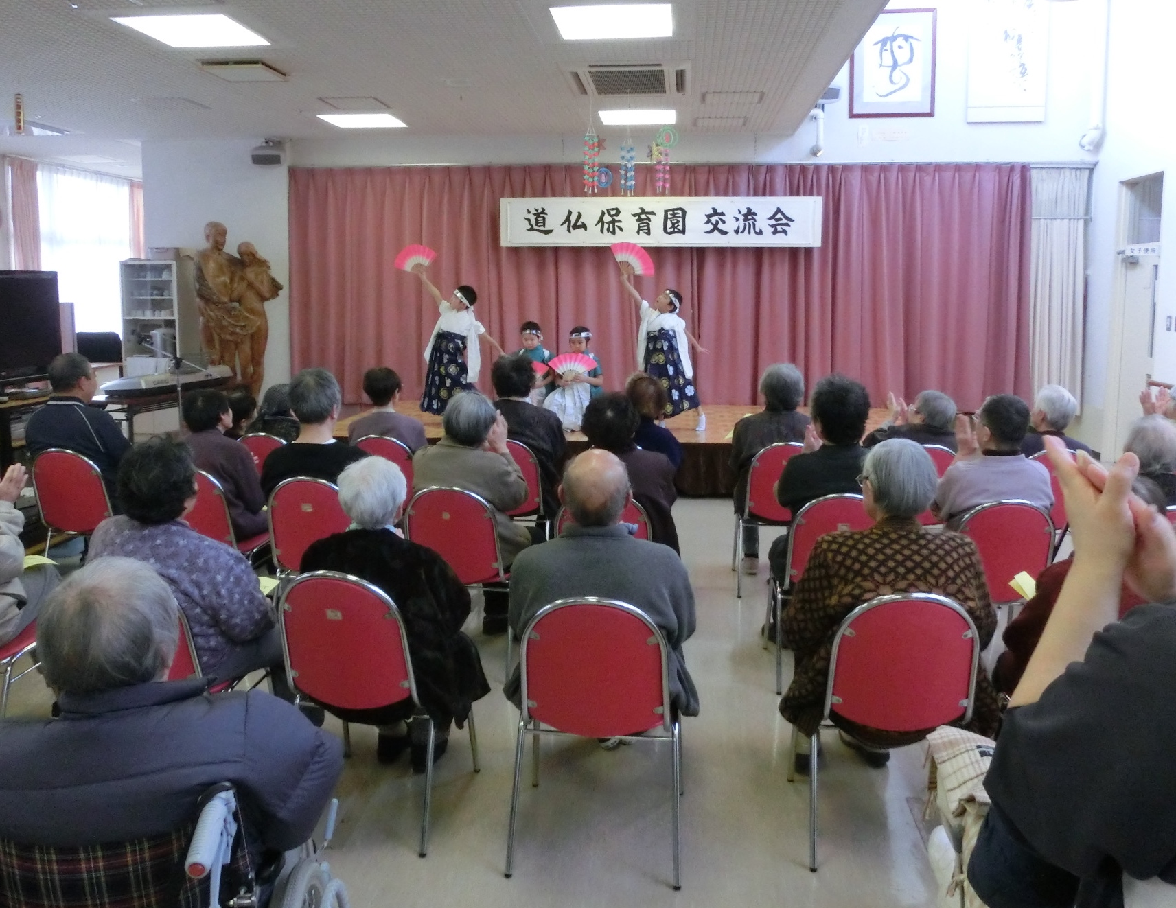 デイサービスの利用者さんを前に、歌やおどりを披露してくれました