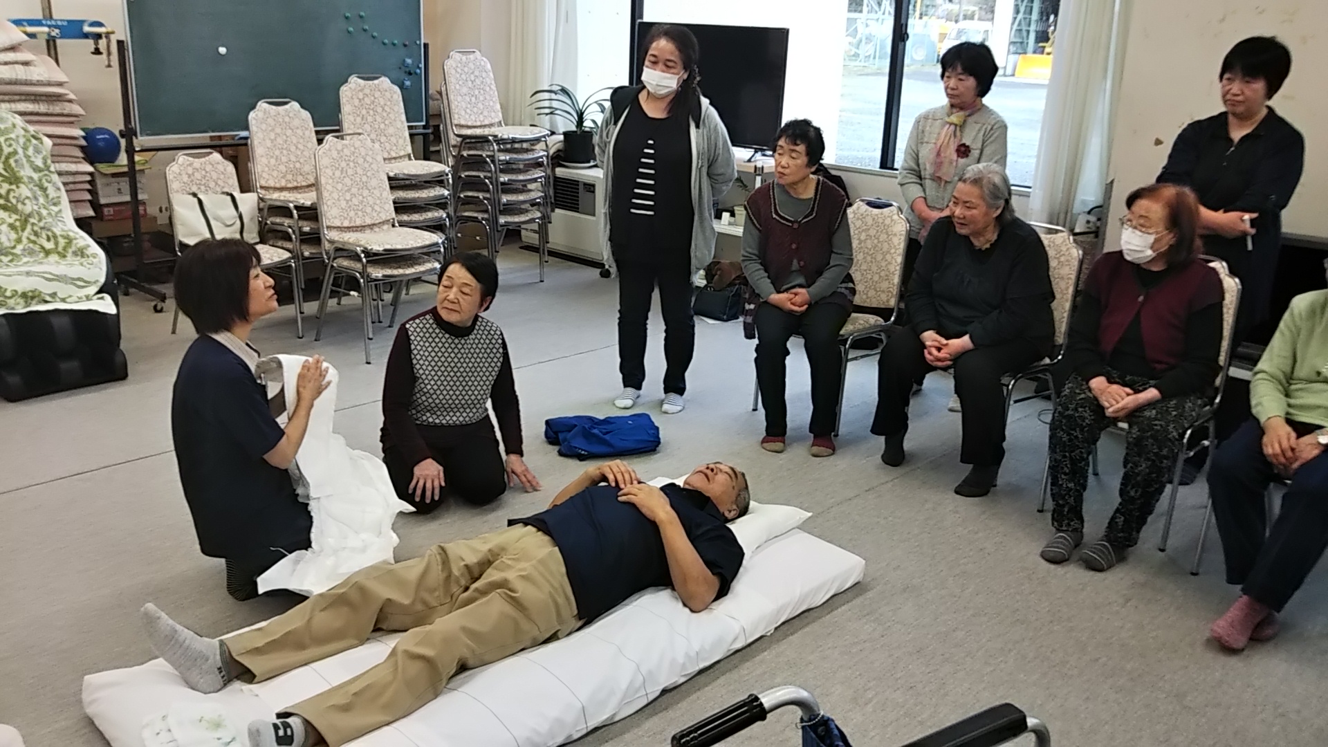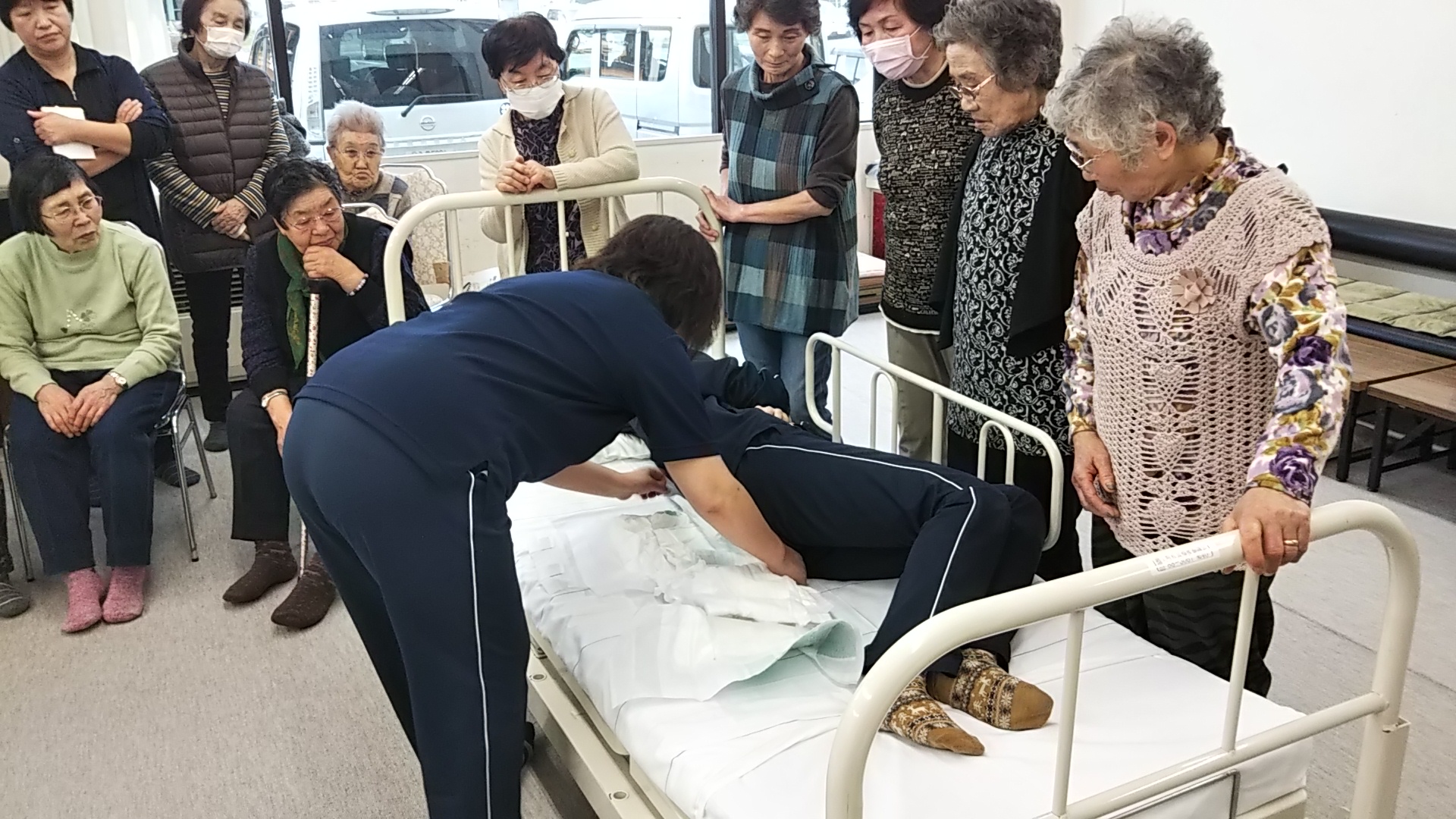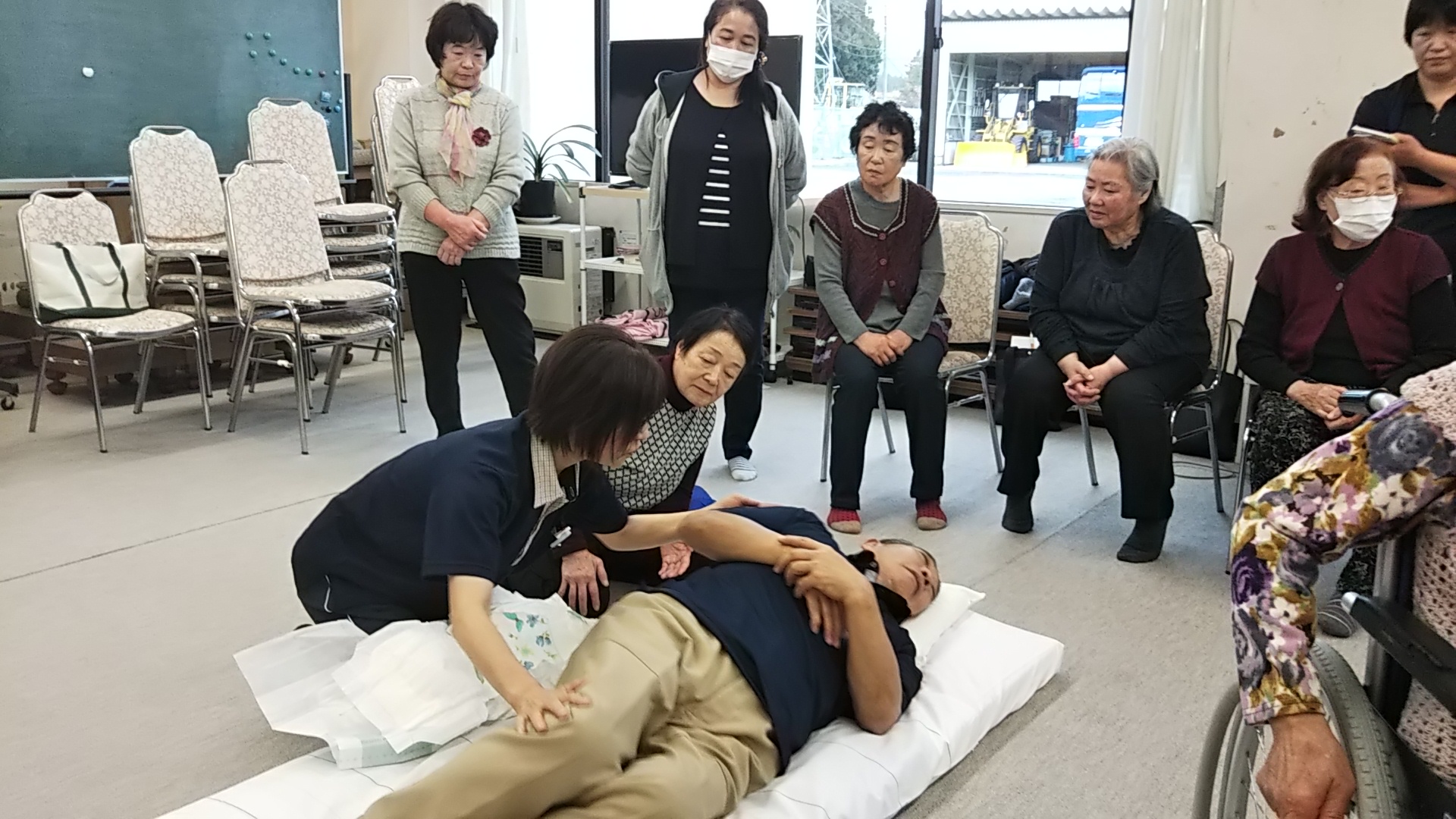 身体の大きい男性は力任せで行うと、介護者側が腕や腰を痛めるのでコツを伝えていました