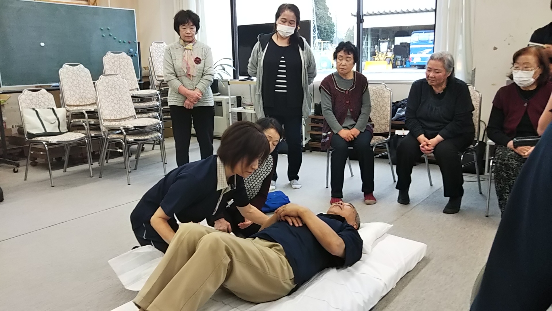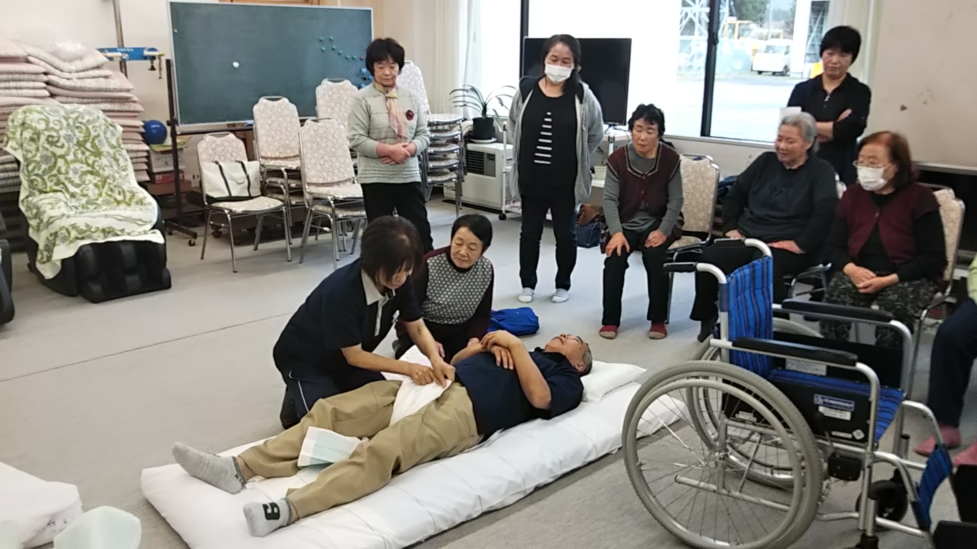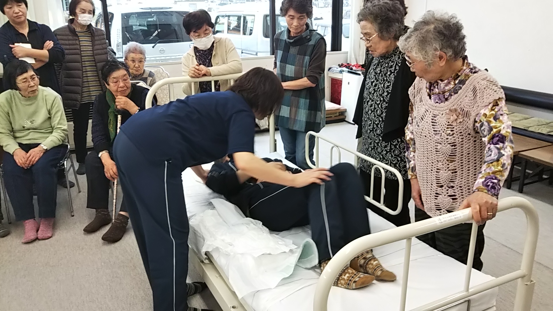 身体の大きい男性は力任せで行うと、介護者側が腕や腰を痛めるのでコツを伝えていました